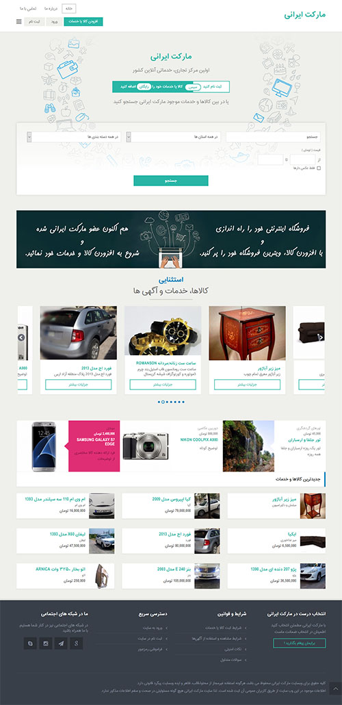 وب سایت مارکت ایرانی به عنوان یک مرجع آگهی های تبلیغاتی برای خرید و فروش کالاهای نو دست دوم مشابه سایت هایی مثل دیوار و شیپور می باشد. این وب سایت امکانات کاملی نظیر آگهی فوری، ویژه، جستجوی پیشرفته، دسته بندی کامل محصولات، قیمت توافقی و ... دارد.