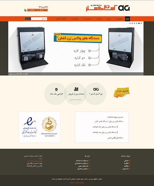 این وب سایت به سفارش شرکت آسان گستر، از واحدهای تولیدی دستگاه های واکس زن کفش اتوماتیک طراحی و اجرا گردیده است. این شرکت از برترین تولیدی های کشور بوده و به عنوان یکی از قطب های تولید دستگاه های واکس کفش و دستگاه های نظافتی صنعتی می باشد.