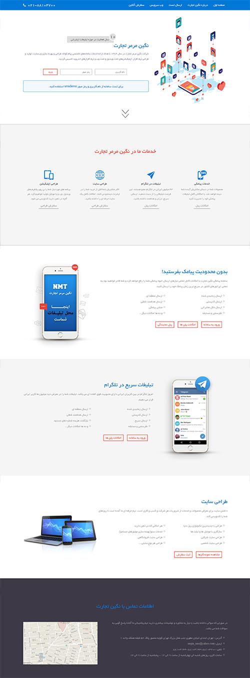 شرکت نگین مرمر تجارت از جمله شرکت های پیشرو در ارائه خدمات سامانه پیامک کوتاه برای ارسال تبلیغات انبوه پیامکی و هم چنین تبلیغ در تلگرام می باشد. علاوه بر ارائه خدمات سامانه های پیام کوتاه، طراحی و بهینه سازی وبسایت، تولید و طراحی نرم افزار، اپلیکیشنهای تحت ویندوز و تحت وب و نرم افزارهای اندروید از دیگر خدمات این شرکت می باشد.